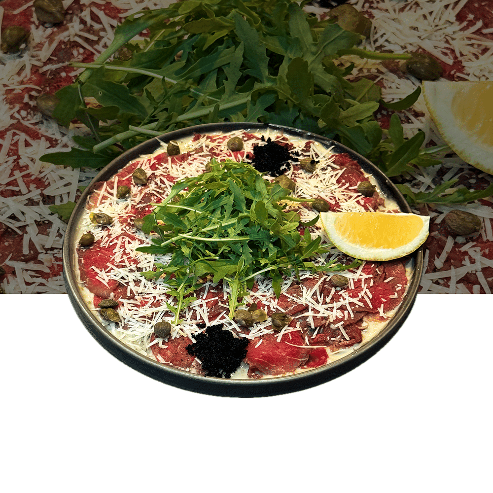 Тонко нарезанная нежнейшая говяжья вырезка, на чесночном соусе с дополнением из свежих салатов, сыра Пармезан и оливкового масла.