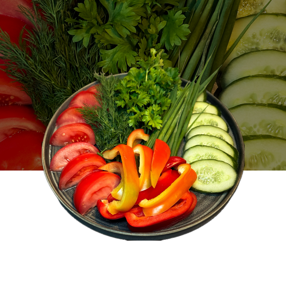 Огурец, томат, перец подаётся со свежей сезонной зеленью.