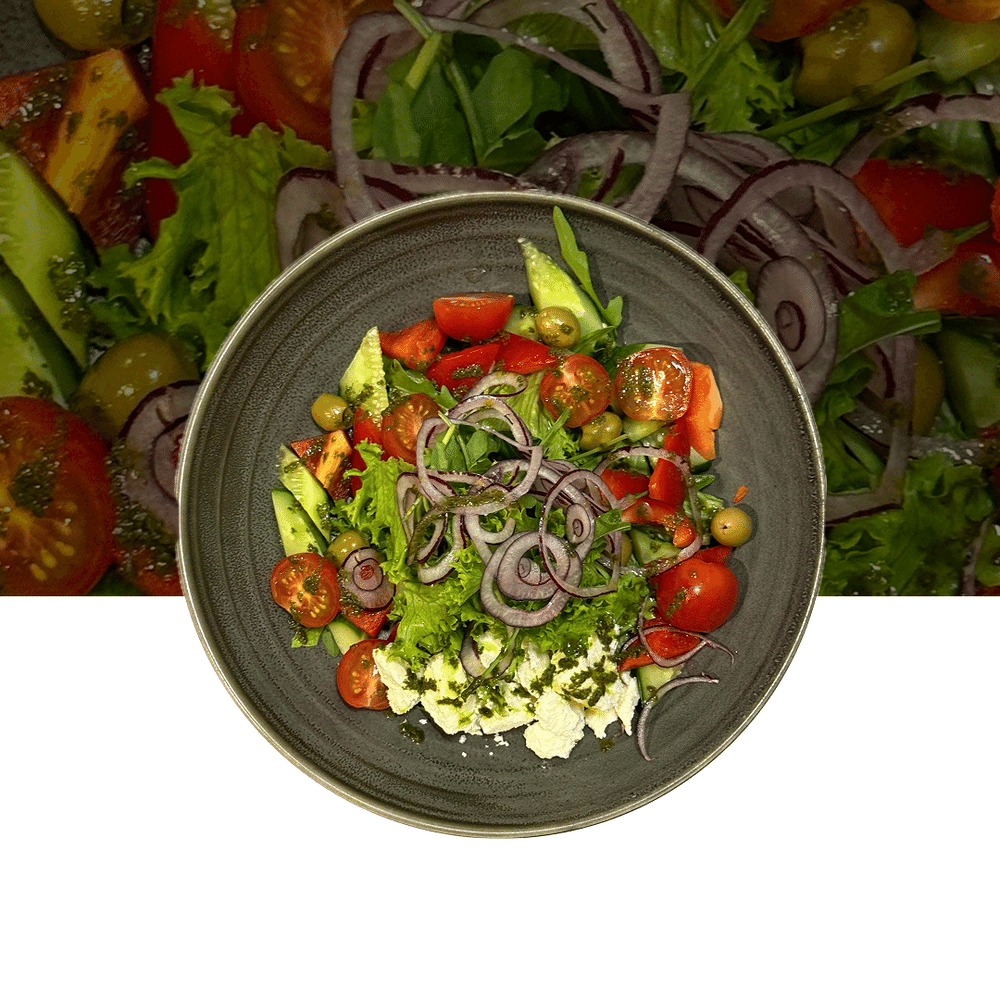 Салат из свежих овощей с рукколой ,оливками и брынзой с ароматным оливковым маслом