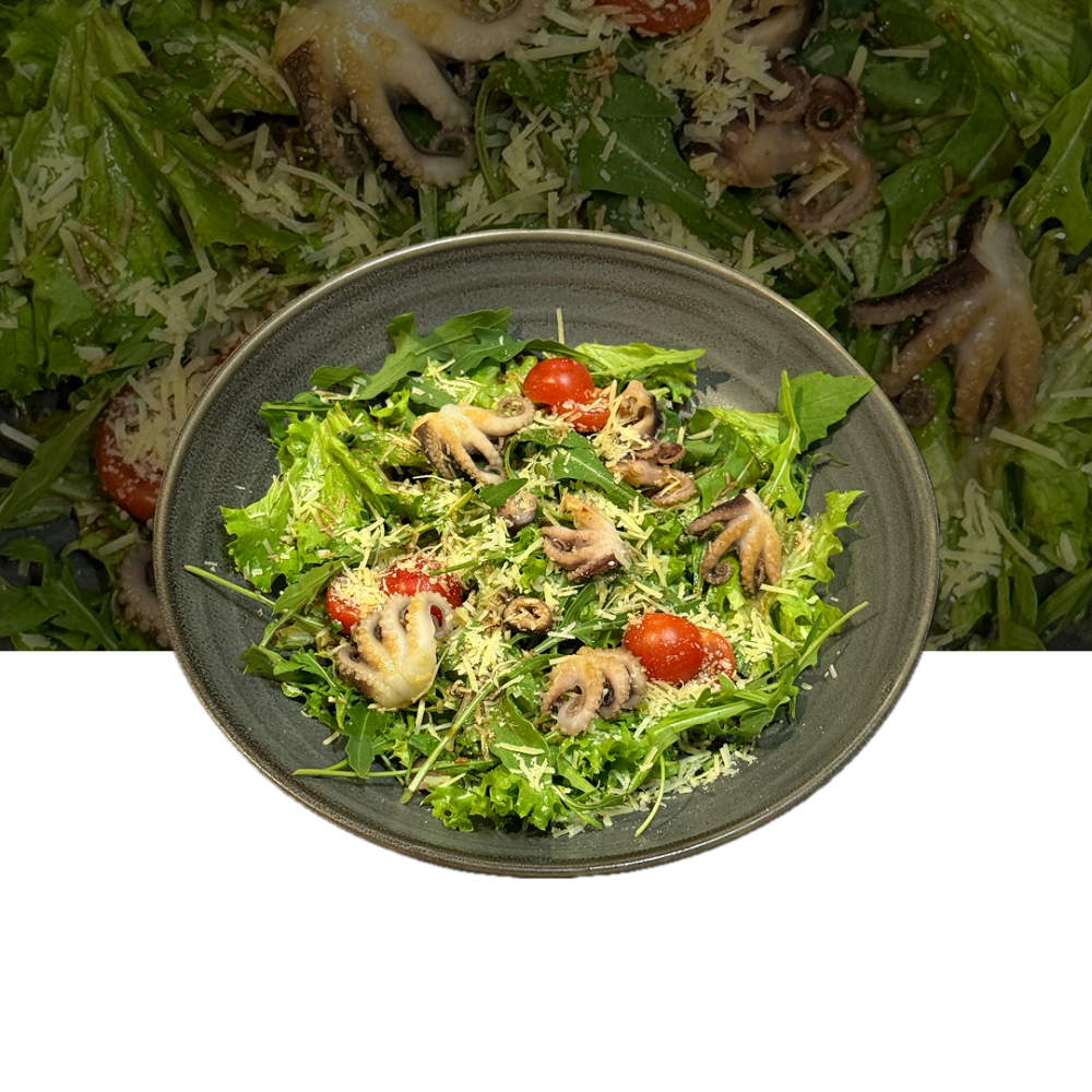 Кальмар с рукколой и тапенадом из вяленых томатов