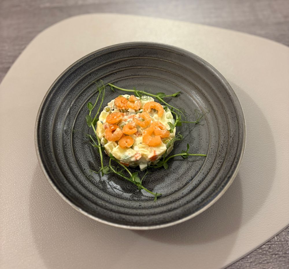 Картофель, морковь, яйца, огурец, горошек, креветки, майонез, зелень