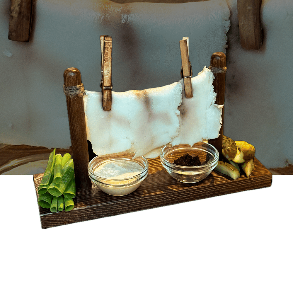 Домашнее белое смолёное сало с Русской горчицей, абхазской аджикой, луком и маринованными огурцами.