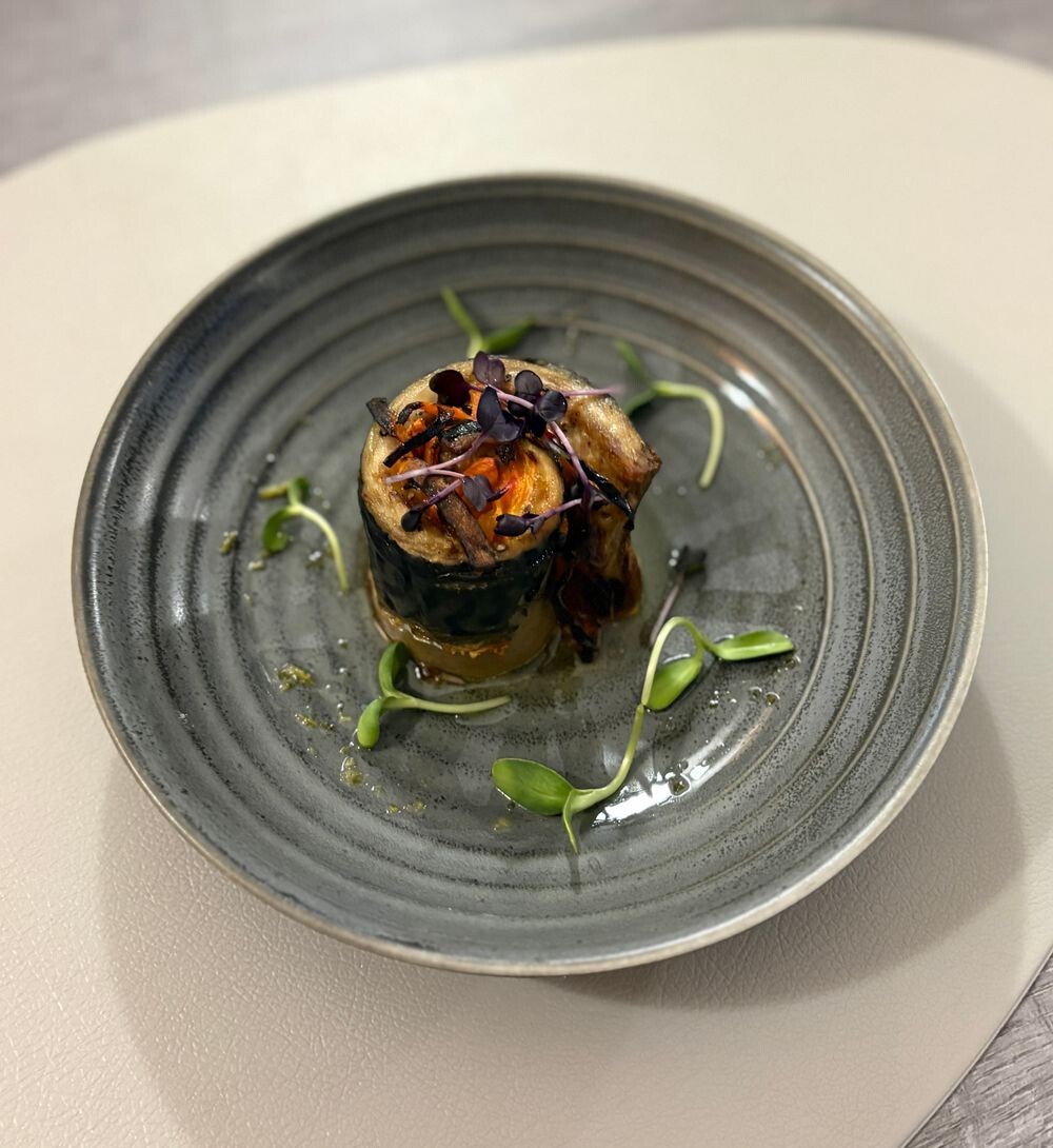 Скумбрия филе, перец, лук репчатый, морковь, масло чесночное, соус песто, зелень