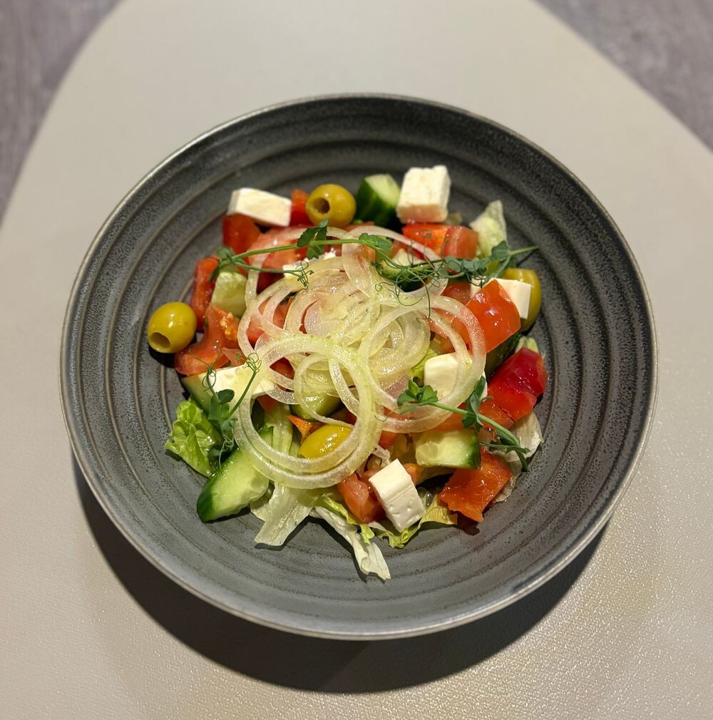 Огурец, томат, перец, сыр фета, салат, оливковое масло, оливки, лук