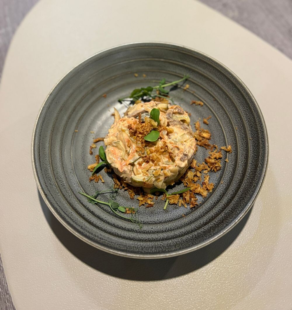 Морковь, лук, огурец консервированный, говядина, томатный кетчуп, майонез