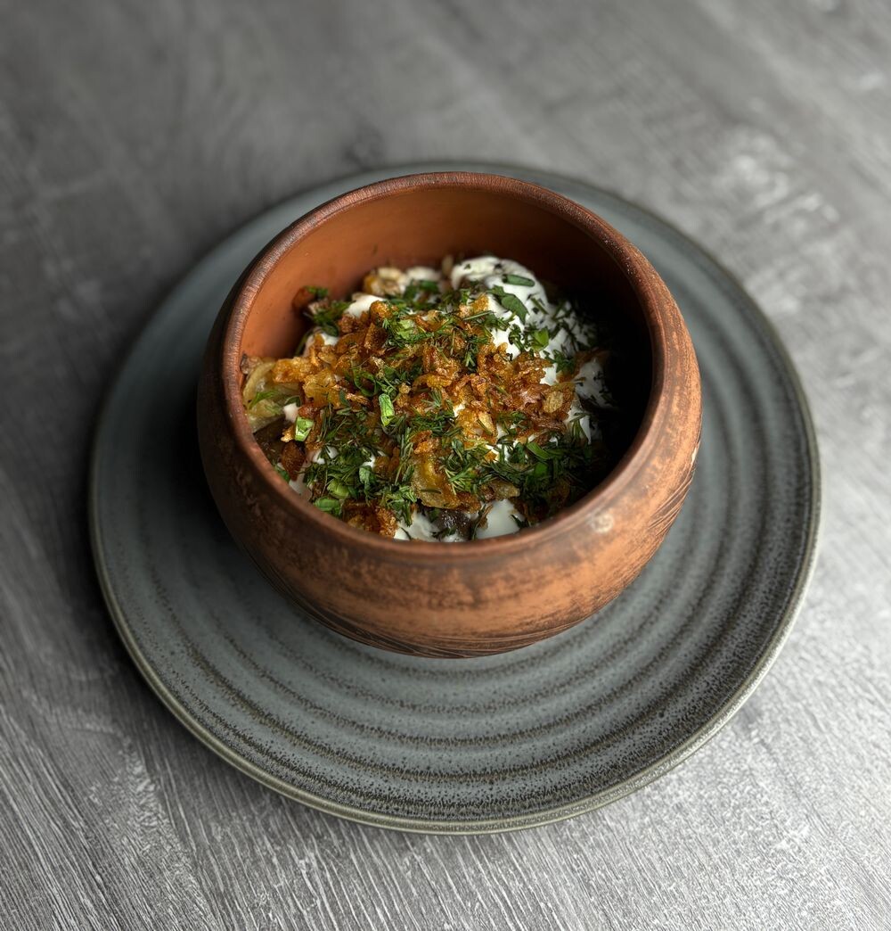 Картофель печёный, рёбра томлёные, шампиньоны жареные, лук пассерованный, сметана, зелень