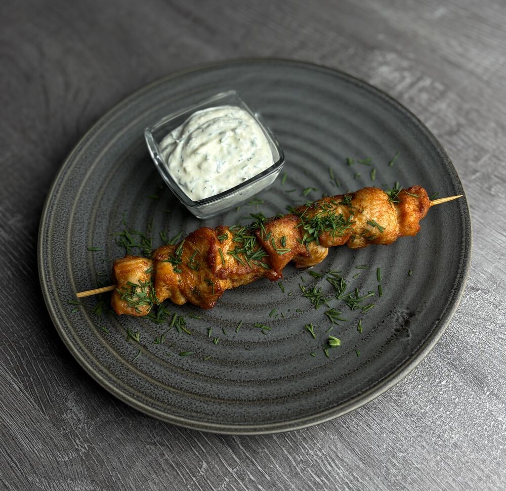 Соус тум, филе цыплёнка, приправа для гриля, зелень, лук репчатый