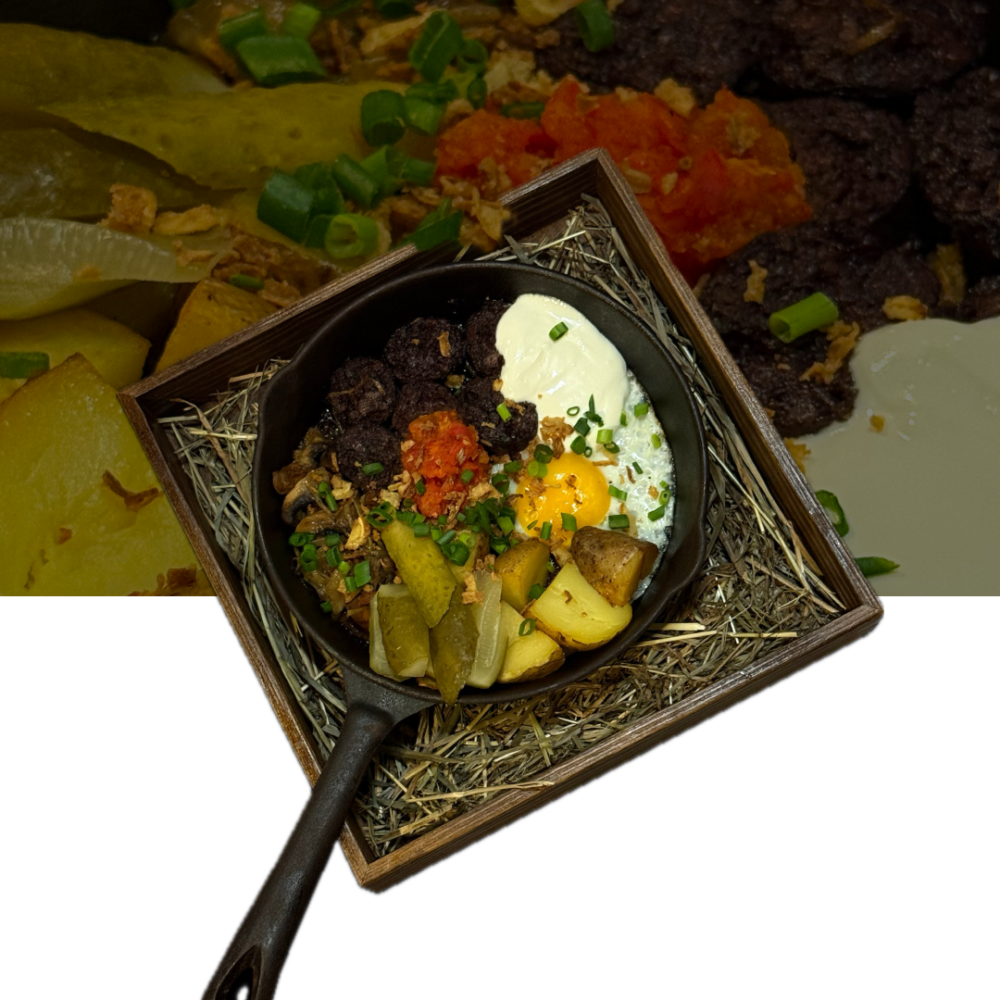 Жаренная на сковороде кровяная колбаса с картофелем, лесными грибами и яйцом. С дополнением из сметаны, домашней аджики, зелени и маринованного огурца.
