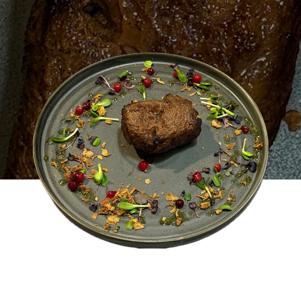 Традиционный говяжий стейк из средней части говяжьей вырезки с ароматным маслом. (Прожарка по желанию).
