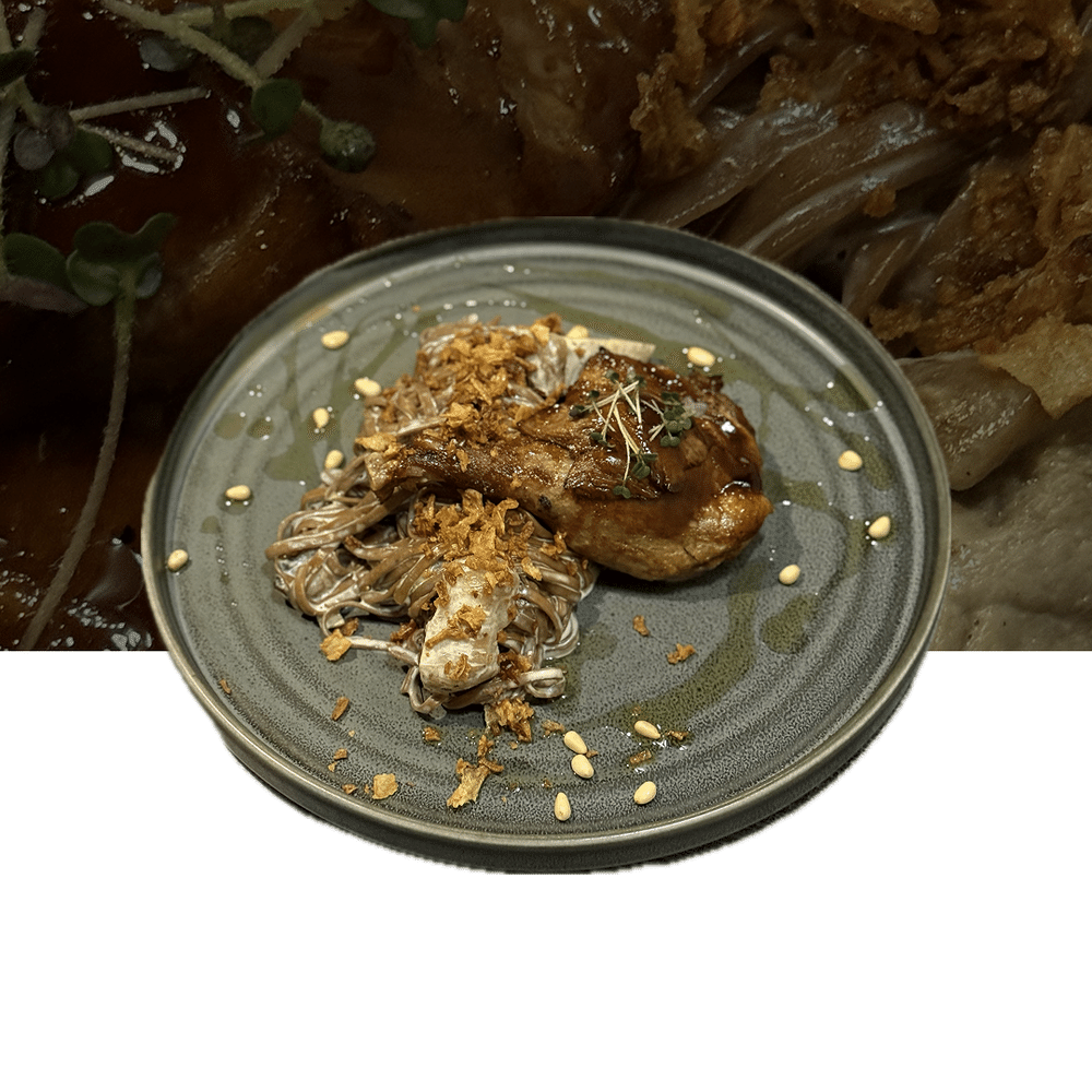 Утиная ножка конфи запечённая в соусе терияки подаётся с гречневой лапшой и белыми грибами.