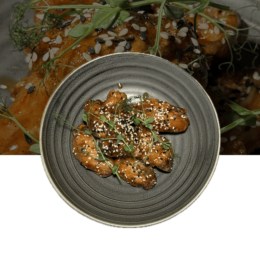 хрустящие куриные крылышки, обжаренные в масле с кисло-сладким соусом и кунжутным маслом.